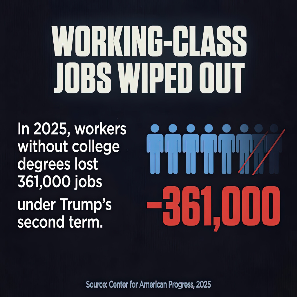 Trump’s entire first year back in office produced fewer than 200,000. Among those losses, 361,000 working-class jobs — held by workers without college degrees — were eliminated in 2025 alone.