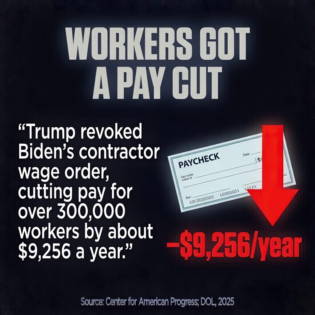 And in the middle of all of this, Trump revoked a Biden executive order that had raised the minimum wage for 300,000 federal contractors, cutting roughly $9,256 per year from their paychecks.