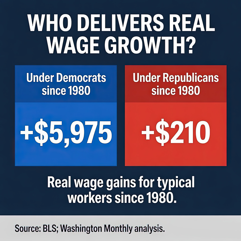 Since 1980, real wages grew by $210 under Republican presidents over 23 years in power. Under Democrats, they grew by $5,975 — roughly 40 times more.