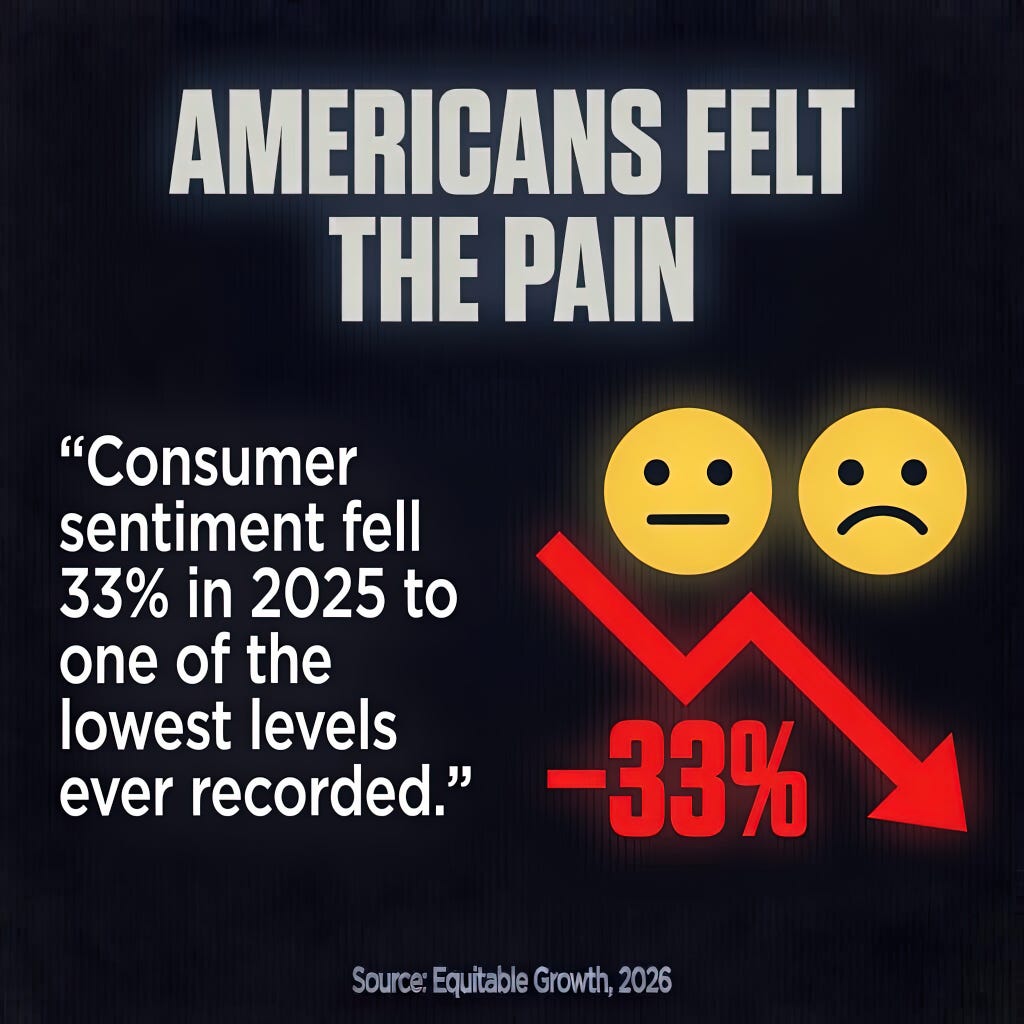 Real wages declined. Median weekly earnings grew at just 0.7%, half the rate of 2024. Disposable income sat at 0.4%. Consumer sentiment collapsed 33% to near-record lows.