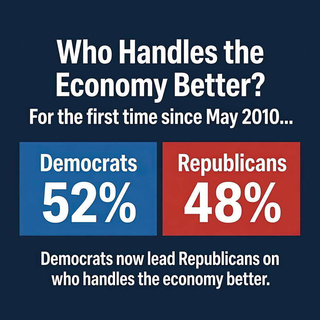 For the first time since May 2010, Democrats lead Republicans on who handles the economy better — 52 to 48.