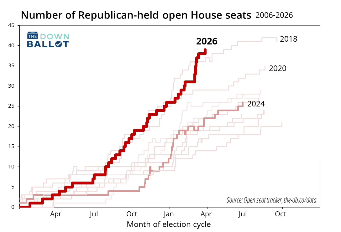 In the run-up to the 2018 midterms, the GOP experienced the largest wave of retirements and resignations in its history, with 41 members choosing to quit rather than face the voters. So far in 2026, that number stands at 36, but we are still several months away from Election Day, and Republicans are on pace to break their previous record by a significant amount, indicating that this cycle could be an even bigger wave election than what we saw in 2018.